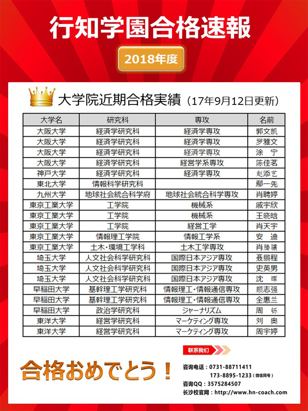 埼玉大学的日本语教育专业(国际日本亚细亚专攻)行知学园有4名学员参加考试,合格3名,该研究科外部生共招6名,行知占了3名!