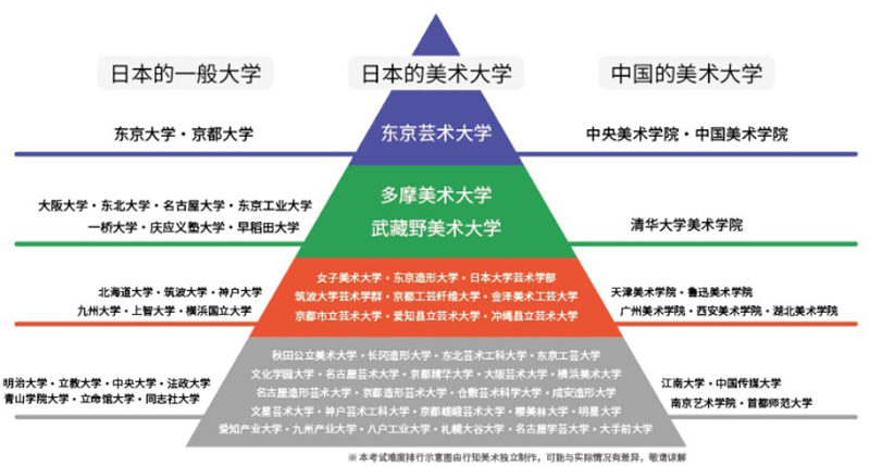 以下为日本的美术大学考试难易度排行示意图,置于左右两侧的分别是难度相当的日本一般大学和中国的美术大学(学院),供于参考。