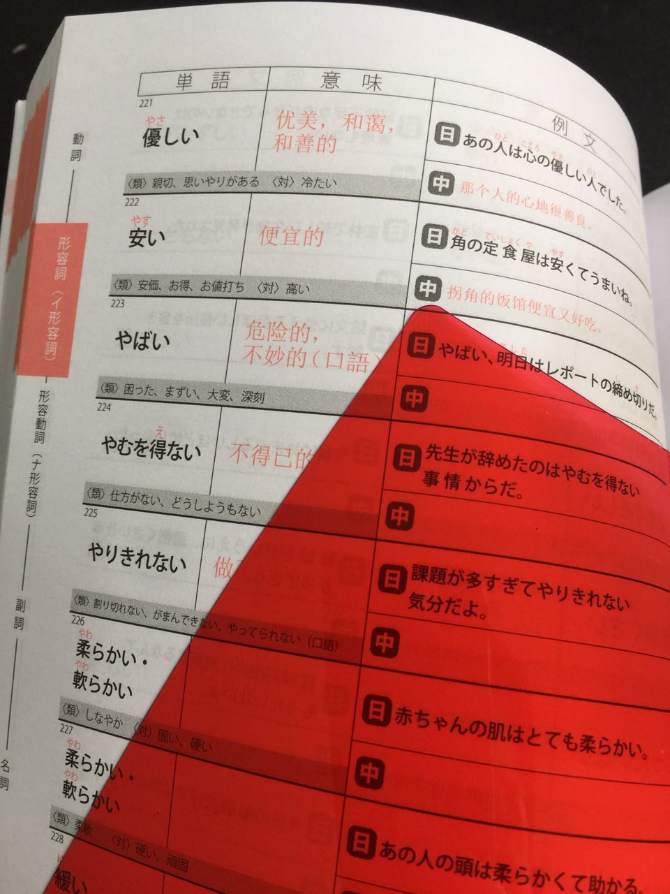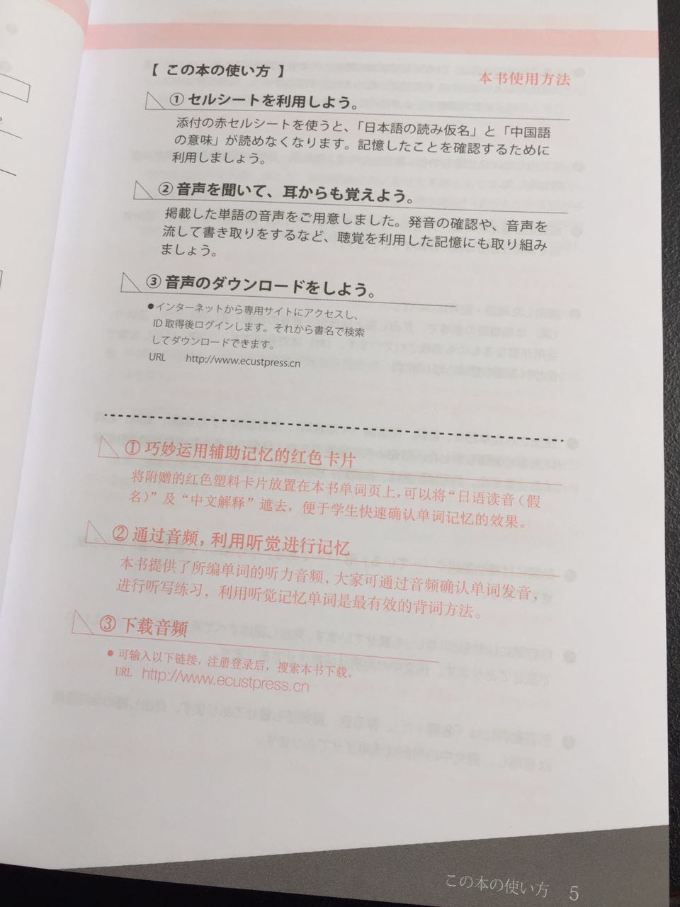 将小红卡放置在本书单词页上可以将日语读音及中文解释遮掉坐车途中,睡觉前,上厕所的时候(嗯...是的),随时随地可以进行单词记忆练习